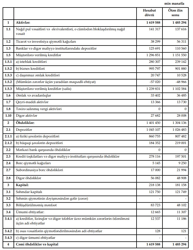 Bankın məcmu kapitalı ilin əvvəlindəki 185 milyon 14 min manatdan 221 milyon 772 min manata yüksəlib. Artım 36,8 milyon manat və ya 19,9% təşkil edib.