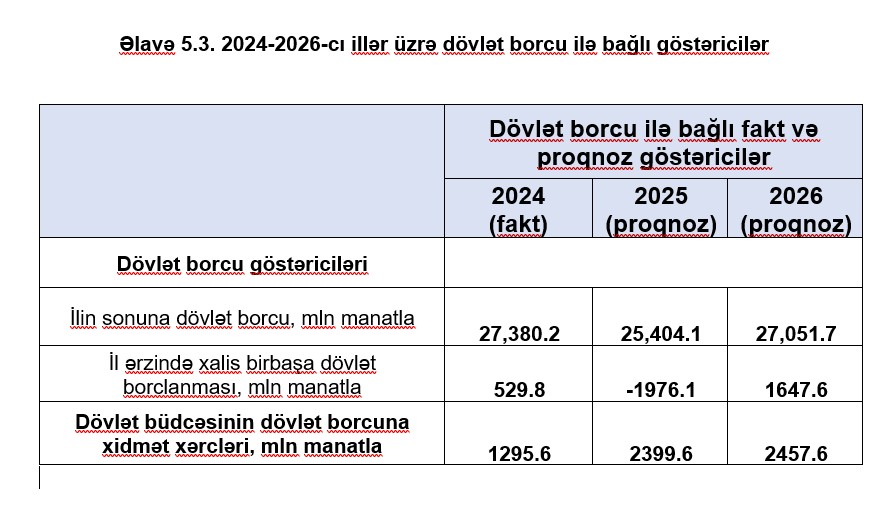 Rəqəmlərə əsasən, 2025-ci ildə dövlət borcu 1 milyard 976,1 milyon manat azalaraq 25 milyard 404,1 milyon manata enəcək. Lakin 2026-cı ildə borcun yenidən 27 milyard 51,7 milyon manata yüksələcəyi proqnozlaşdırılır.