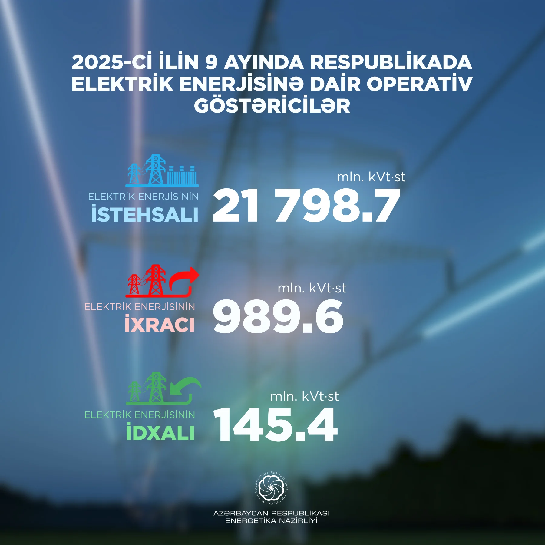 Energetika Nazirliyinin yaydığı məlumatda bildirilir ki, 2025-ci ilin 9 ayı üzrə operativ məlumatlara əsasən, respublikada elektrik enerjisinin istehsalı 12,1 mln. kVt·st, yəni 0,1 % artaraq 21 798,7 mln. kVt·st olub.