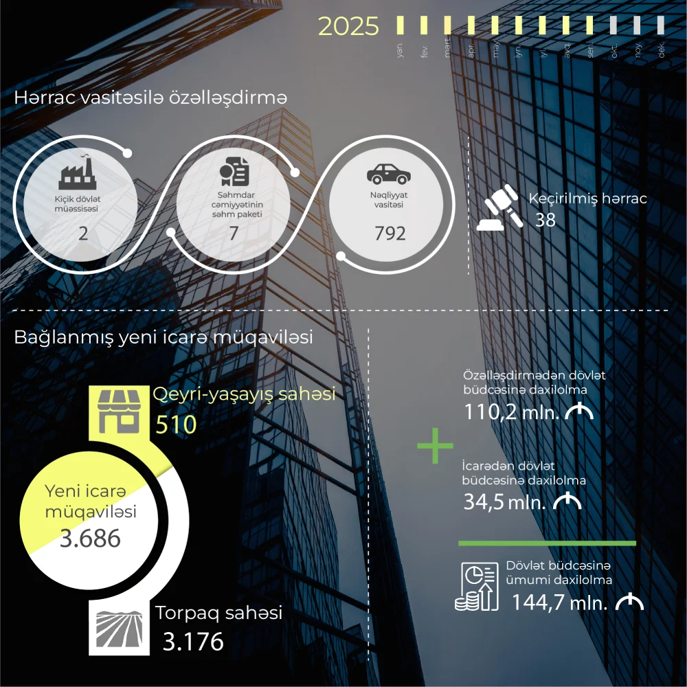 Beləliklə, 2025-ci ilin yanvar-sentyabr ayları ərzində dövlət əmlakının özəlləşdirilməsindən və icarəsindən büdcəyə ümumilikdə 144,7 milyon manat vəsait daxil olub.