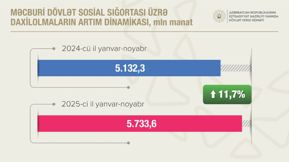 2025-ci ilin yanvar – noyabr aylarında muzdlu işçi sayının və əməkhaqqı fondunun “ağarması” şəraitində məcburi dövlət sosial sığorta haqları üzrə daxilolmalar 5 milyard 733,6 milyon manat təşkil edib. Bu mənbədən daxilolmalar əvvəlki ilin müvafiq dövrü ilə müqayisədə 11,7 faiz və ya 601,3 milyon manat artıb. Qeyri-büdcə təşkilatları üzrə daxilolmalar ötən ilin eyni dövrünə nisbətən 12,3 faiz artaraq 3 milyard 832,2 milyon manat olub.