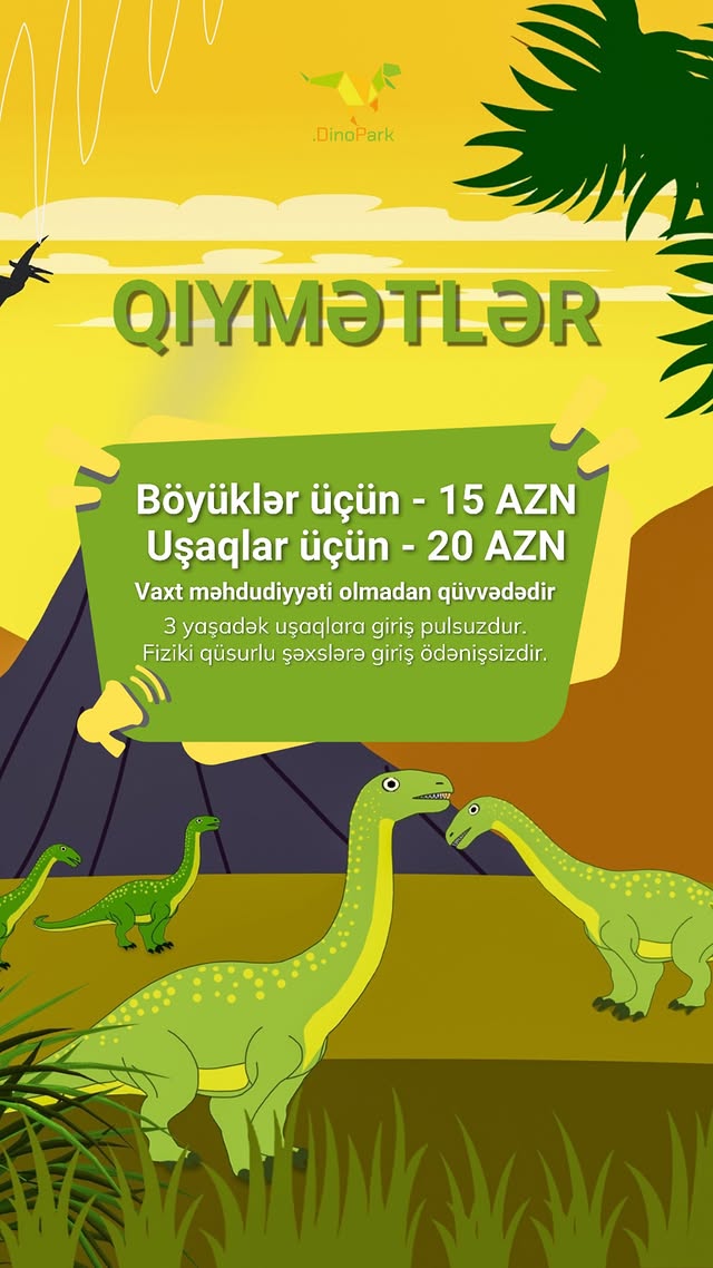 "Dino Park" bu gün məlumat yayaraq bildirib ki, 3 və daha çox uşağı olan ailələr üçün 20% endirim tətbiq oluncaqdır. Bunun üçün təsdiqedici sənəd təqdim edilməlidir.