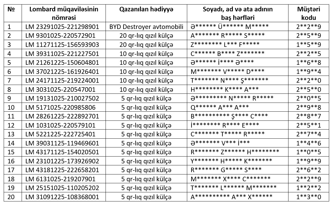 "Qızıl Seçim" lombard lotereyasının 1-ci tirajının 20 qalibinin siyahısını təqdim edirik:
