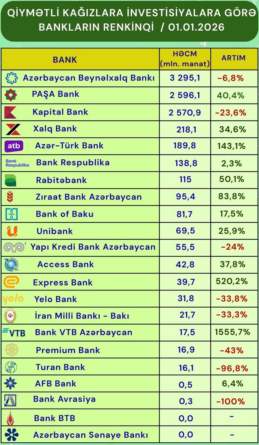 11 bankın isə kapital bazarına investisiyaları artıb. Ən yüksək dinamika “Premium Bank”da (16,6 dəfə), ən aşağı dinamika isə “Rabitəbank”da (2,3%) qeydə alınıb.