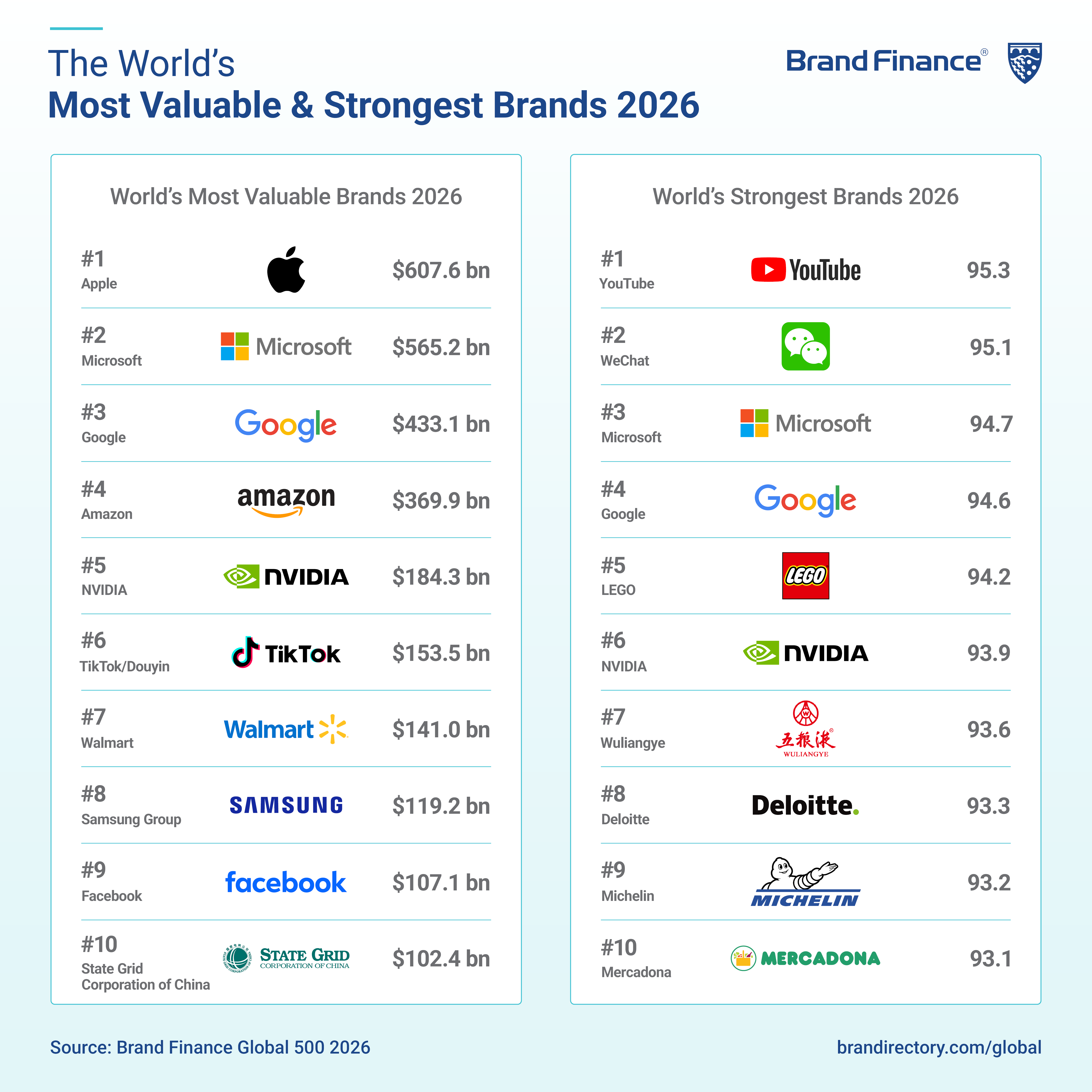 Brand Finance Global500 2026 dünyanın ən dəyərli markaları 2026 Global500 reytinqi Brand Finance hesabatı ən dəyərli 20 marka Apple marka dəyəri Microsoft marka dəyəri Google marka dəyəri Amazon marka dəyəri Walmart marka dəyəri Samsung Group marka dəyəri TikTok marka dəyəri Facebook marka dəyəri NVIDIA marka dəyəri State Grid marka dəyəri Deutsche Telekom marka dəyəri Instagram marka dəyəri ICBC marka dəyəri China Construction Bank marka dəyəri Agricultural Bank of China marka dəyəri Bank of China marka dəyəri Verizon marka dəyəri Toyota marka dəyəri Home Depot marka dəyəri Tesla marka dəyəri qlobal marka reytinqləri dünyanın ən bahalı brendləri texnologiya markaları bank sektorunda marka dəyəri sosial media markaları pərakəndə sektor markaları süni intellekt və marka dəyəri