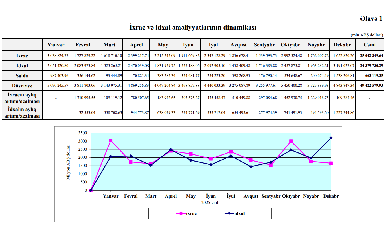 O cümlədən, 2025-ci ildə idxal əməliyyatları üzrə 24 milyard 379 milyon 730 min ABŞ dolları, ixrac əməliyyatları üzrə 25 milyard 42 milyon 850 min ABŞ dolları ticarət qeydə alınıb, saldo müsbət 663 milyon 119  min ABŞ dolları olub.