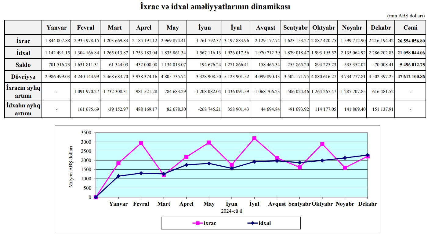 Xatırladaq ki, 2024-cü ildə  Azərbaycanın xarici ticarət əməliyyatlarının həcmi 47 milyard 612 milyon 101 min ABŞ dolları, o cümlədən, idxal əməliyyatlarının cəmi dəyəri 21 milyard 58 milyon 44 min ABŞ dolları, ixrac əməliyyatlarının cəmi dəyəri 26 miilyard 554 milyon 57 min ABŞ dollar, saldo müsbət 5 milyard 496 milyon 13 min ABŞ dolları təşkil etmişdi.