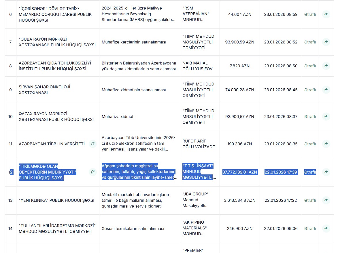 Dövlət qurumu "T.T.Ş.-İNŞAAT" şirkətinə 38 milyon manatlıq sifariş verildi