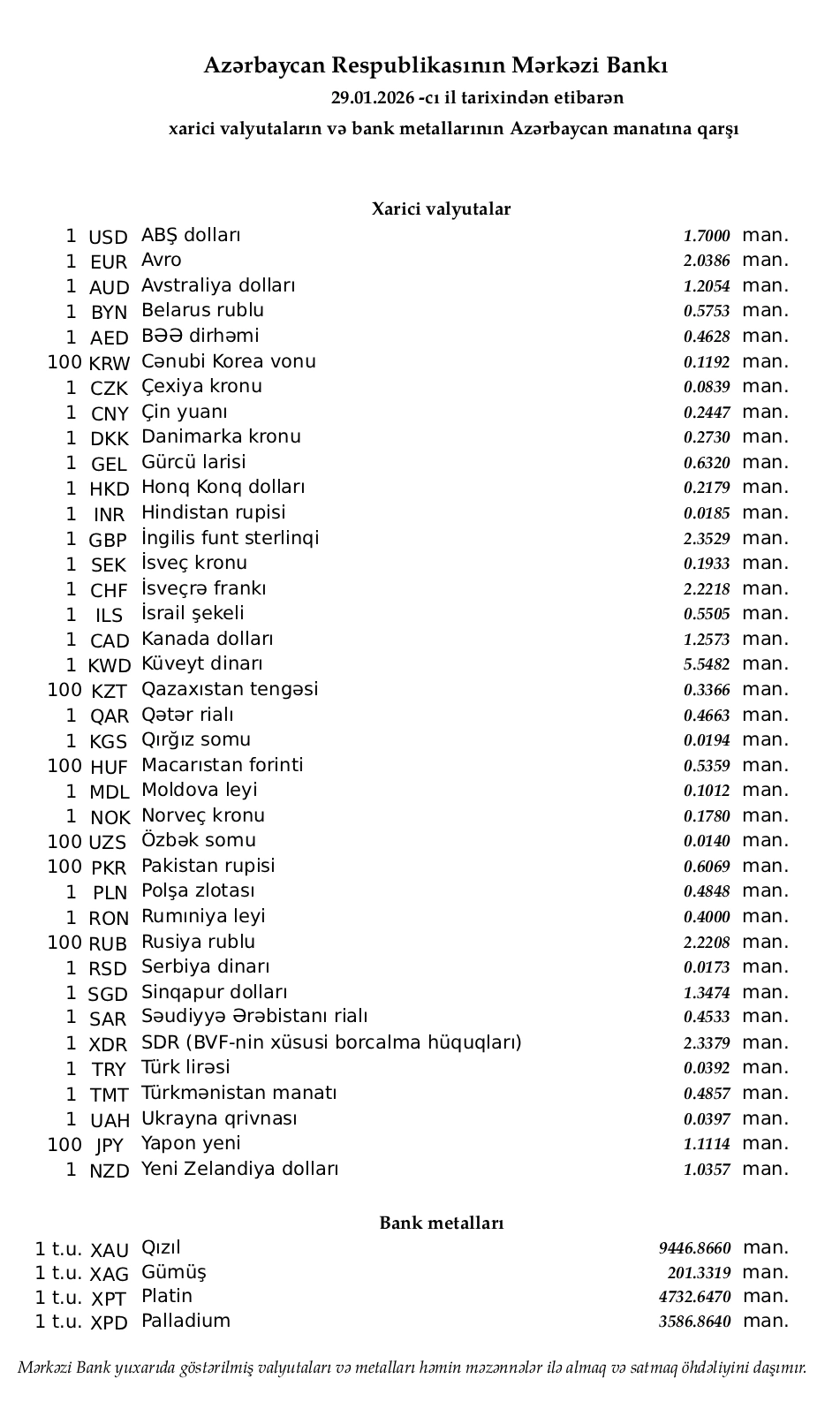 Rəsmi məzənnələr açıqlandı