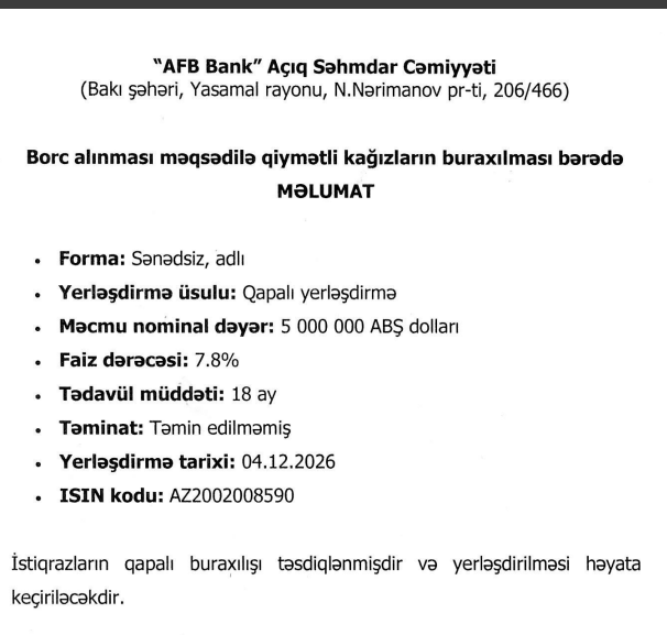 “AFB Bank” ASC borc alınması məqsədilə qiymətli kağızların buraxılması barədə məlumat yayıb.
