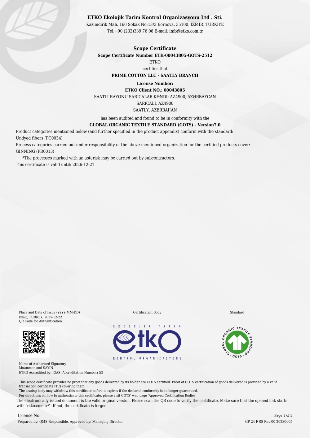 Şirkət GOTS – Global Organic Textile Standard sertifikatını uğurla əldə edərək, orqanik pambığın tarladan son məhsula qədər tam izlənə bilən, şəffaf və beynəlxalq standartlara uyğun şəkildə idarə olunduğunu rəsmi olaraq təsdiqləmişdir.