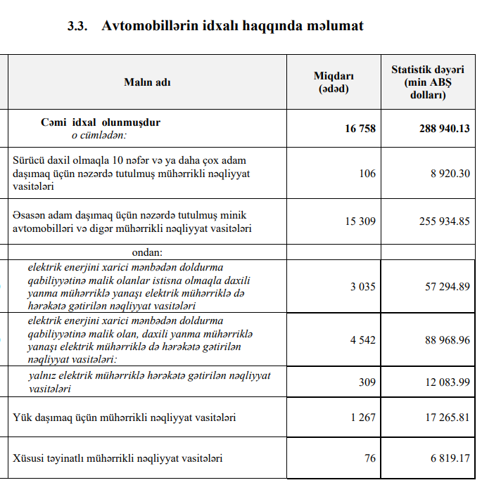 Elektrik və hibrid avtomobillər seqmentində isə fərqli tendensiyalar müşahidə olunur. Yalnız elektrik mühərriki ilə işləyən avtomobillərin idxalı 309 ədəddən 204 ədədə düşərək 105 ədəd və ya 34 faiz azalıb. Bu kateqoriya üzrə idxalın dəyəri isə daha kəskin geriləyərək 12,1 milyon dollardan 5,1 milyon dollara enib ki, bu da 7 milyon dollar və ya 57,9 faiz azalma deməkdir.