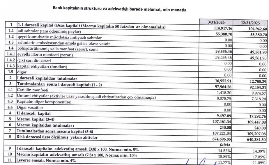 Hesabat dövrünün sonunda bankın kredit portfeli 487 milyon 787 min manat olub. Bu göstərici 2025-ci ilin sonu ilə müqayisədə 20 milyon 529 min manat və ya 4,4 % artım deməkdir. Ötən ilin sonunda kredit portfeli 467 milyon 258 min manat təşkil edirdi.