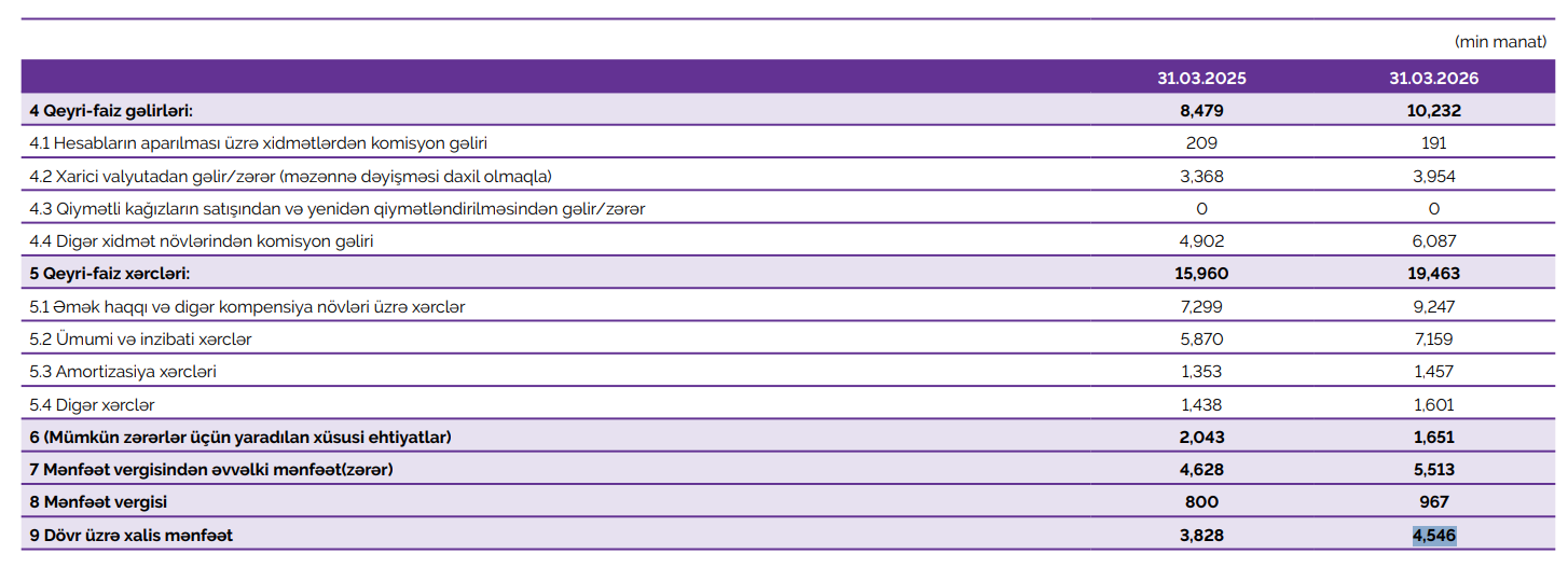Faiz gəlirləri 12,5% artaraq 36,3 milyon manata, qeyri-faiz gəlirləri isə 20,6% yüksələrək 10,2 milyon manata çatıb.