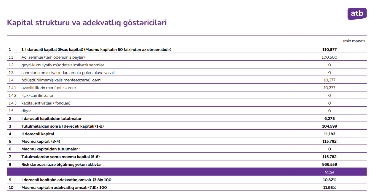 Hesabat dövründə məcmu kapital 115,8 milyon manat təşkil edib ki, bu da illik müqayisədə 12,3 milyon manat və ya 12% artım deməkdir. Kapitalın artımı Bankın gələcək inkişafını dəstəkləyən mühüm baza kimi çıxış edir və potensial risklərə qarşı dayanıqlılığı artırır.
