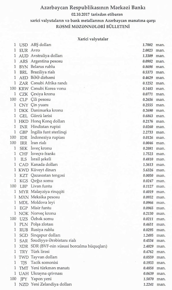 Oktyabrın 2-nə Mərkəzi Bankın açıqladığı rəsmi Dollar/manat məzənnəsi Sentyabrın 28-i ilə müqayisədə dəyişməyərək 1,7002 manat olub, Avro/manat məzənnəsi isə 2.0023 manata düşüb.