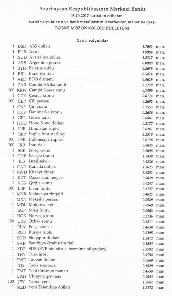 Oktyabrın 4-də rəsmi olaraq 1 dollar 1,7002 manata, 1 avro isə 2.0005 manata bərabər idi.