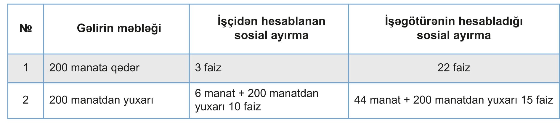 Vergi Məcəlləsinin 101.1-ci maddəsinə əsasən, 2500 manatadək olan aylıq gəlirdən 14 faiz gəlir vergisi tutulur. «Sosial sığorta haqqında» Qanunun 14-cü maddəsinə əsasən, əmək müqaviləsi (kontraktı) ilə işləyənlər üçün hesablanmış əməkhaqqının 3 faizi miqdarında məcburi dövlət sosial sığorta haqqının ödənilməsi nəzərdə tutulub. Bundan başqa, əməkhaqqının 0,5 faizi həcmində işsizlikdən sığorta ödənişi hesablanır.