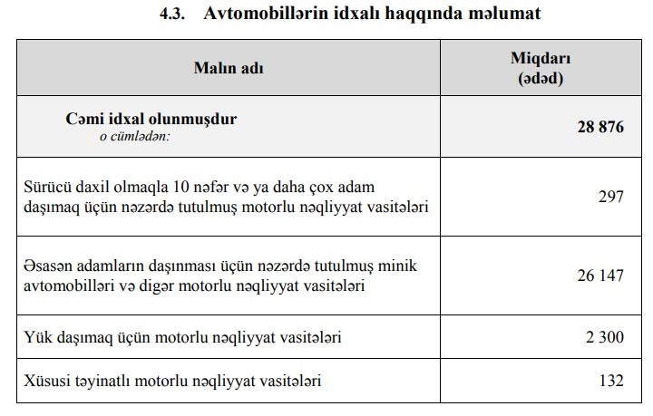 2018-ci ilin 12 ayı ərzində ölkəmizə cəmi 28 876 ədəd avtomobil idxal olunub. Bu, 2017-ci illə müqayisədə 2,2 dəfə çoxdur. 2017-ci ildə 13 098 ədəd nəqliyyat vasitəsi idxal olunmuşdu. İllik müqayisədə minik avtomobili idxalı 11 610 ədəddən 26 147 ədədə yüksəlib.