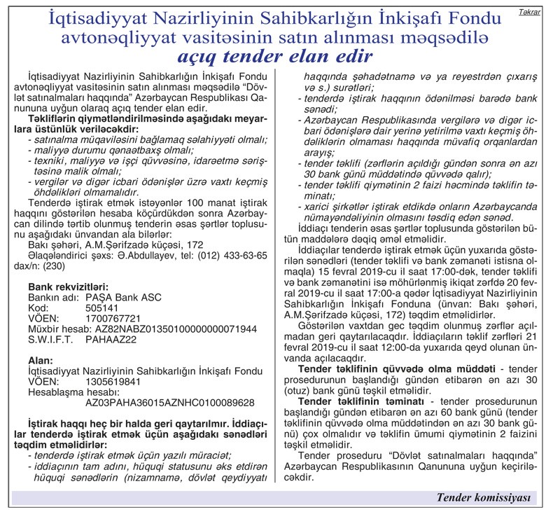 İqtisadiyyat Nazirliyinin Sahibkarlığın İnkişafı Fondu avtomobillər satın alır.