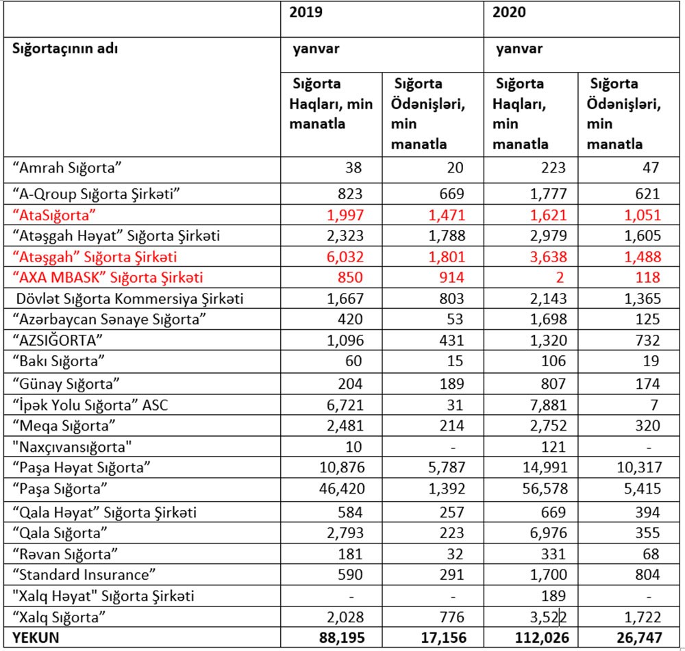 2020-ci ilin Yanvar ayında Azərbaycanda fəaliyyət göstərən 22 sığorta şirkəti tərəfindən 112 milyon 26 min manat sığorta haqları hesablanıb, 26 milyon 747 min manat sığorta ödənişi həyata keçirilib.