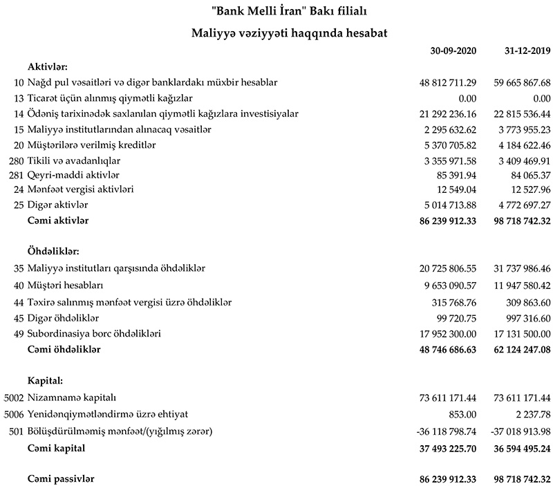 "Bank Melli İran" Bakı filialı 2020-ci ilin 9 ayını 898 min 384 manat xalis mənfəət ilə başa vurub. Halbuki, filial ötən ilin eyni dövründə 19 milyon 315 min 42 manat zərərə düşmüşdü. Ötən il zərər aktivlər üzrə ehtiyatların yaradılmasına 21 milyon 5 min manat ayrılması ilə əlaqədar idi. Ehtiyatın yaradılması filialın xeyli məbləğdə depozit və kreditinin itəcəyi ehtimalının güclənməsi ilə bağlı idi.