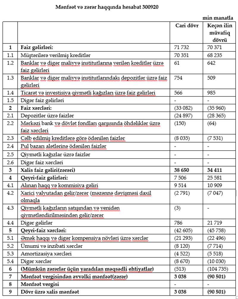 Müqayisə üçün qeyd edək ki, 2019-cu ilin 9 ayında AccessBankın cəmi əməliyyat gəlirləri 95 milyon 952 min manat, cəmi əməliyyat xərcləri 81 milyon 718 min maant, əməliyyat mənfəəti 14 milyon 234 min manat təşkil etmişdi. Bank mümkün itkilər üçün yaradılan məqsədli ehtiyatlara 104 milyon 735 min manat ayırdığından həmin dövrü 90 milyon 501 min manat zərər ilə bağlamışdı.