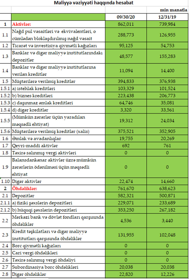 Rabitəbank ASC 2020-ci ilin 9 ayını 3 milyon 844 min manat xalis mənfəət ilə başa vurub. Halbuki, Bank ötən ilin eyni dövründə 7 milyon 621 min manat xalis mənfəət əldə etmişdi. Xalis mənfəətin azalması mümkün zərərlər üçün yaradılan məqsədli ehtiyatlara ayırmanın 3,3 dəfə artması ilə bağlıdır. Bankın cari biznes fəaliyyətinin nəticəsini daha doğru əks etdirən əməliyyat mənfəəti artıb.