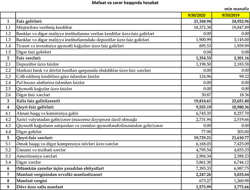 9 ay ərzində “Yapı Kredi Bank Azərbaycan”ın gəlirləri 30 milyon 724 min manat (illik müqayisədə 14,5% az), xərcləri 21 milyon 83 min manat (11,8% az), xüsusi ehtiyatlara ayırmaları 7 milyon 393 min manat (5,8% çox), mənfəət vergisi ödəmələri isə 673 min manat (46,6% az) təşkil edib.