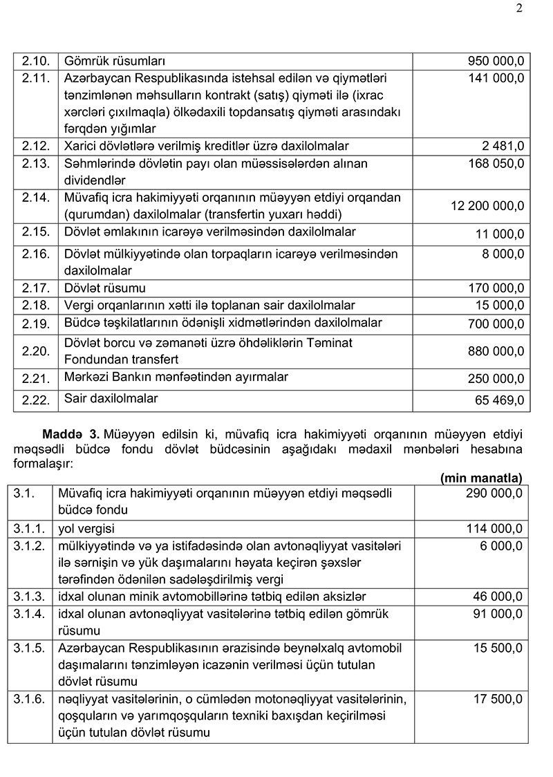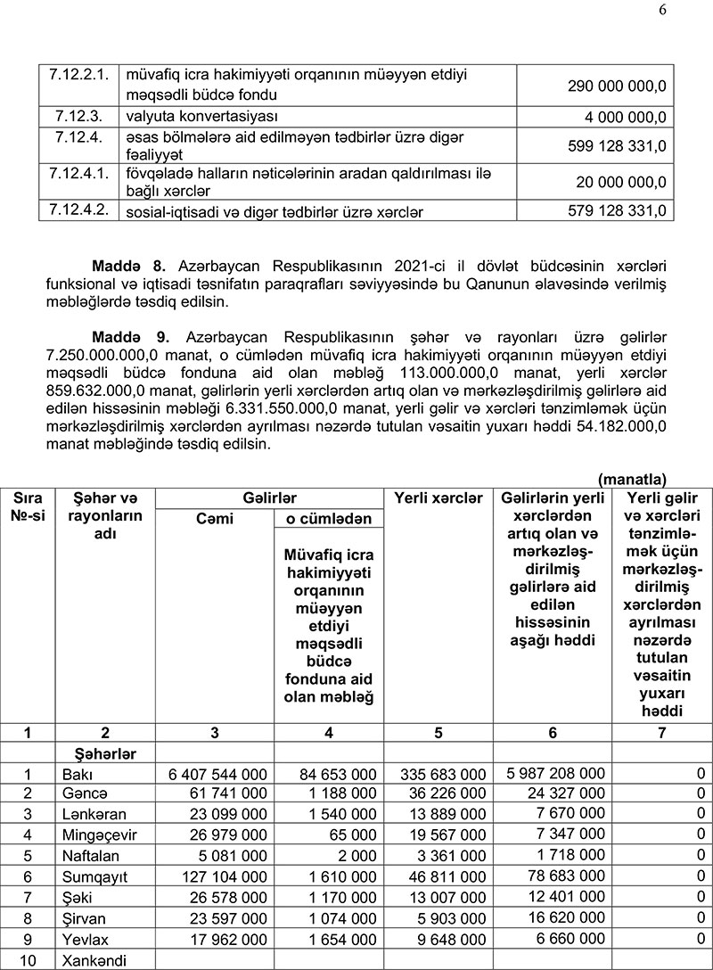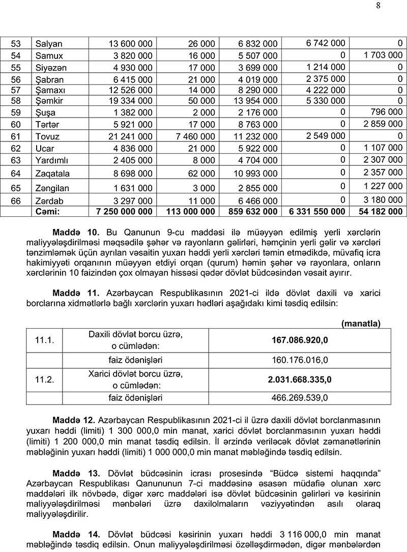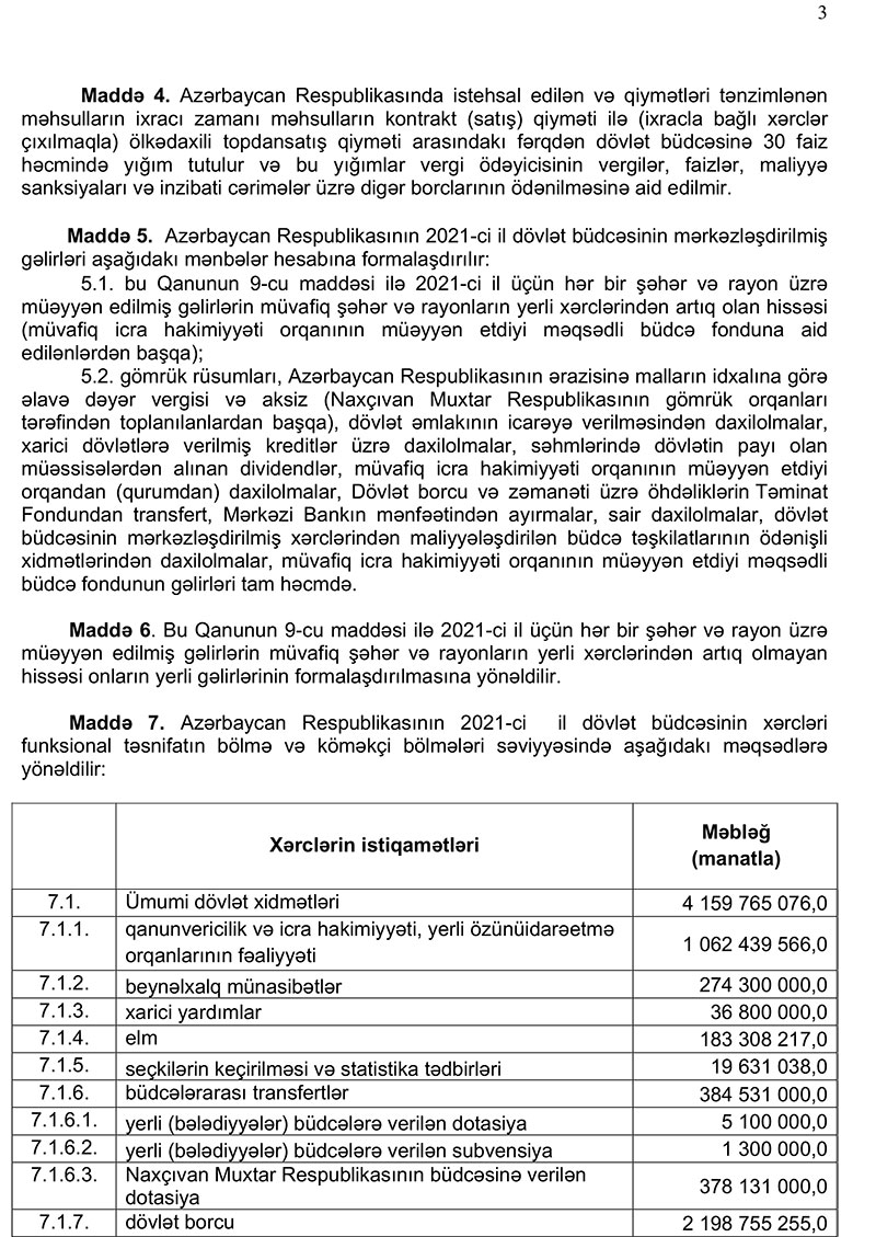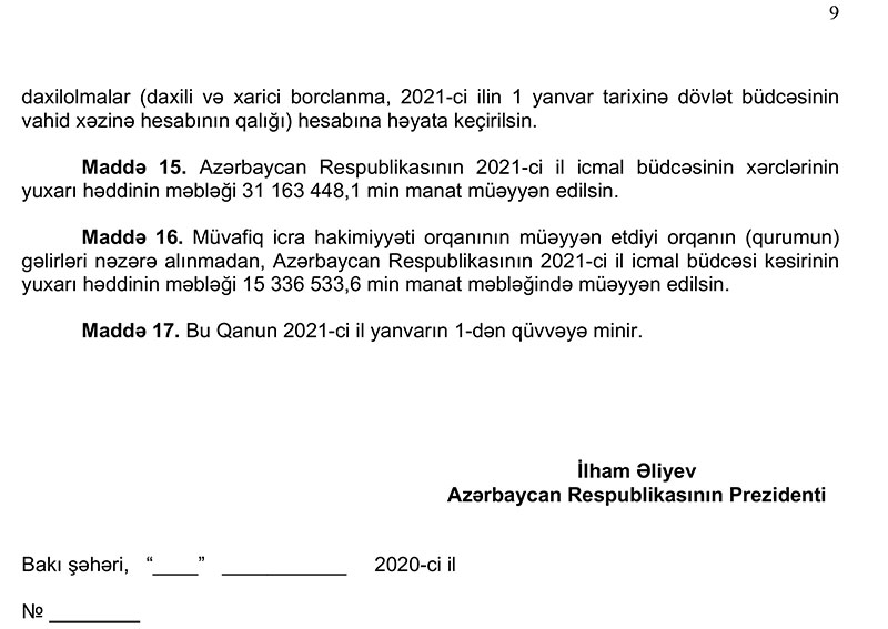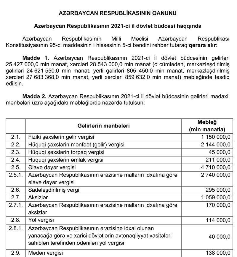 2021-ci il dövlət və icmal büdcənin layihələri Azərbaycan Respublikasının Prezidenti tərəfindən Azərbaycan Respublikasının Milli Məclisinə təqdim olunub.