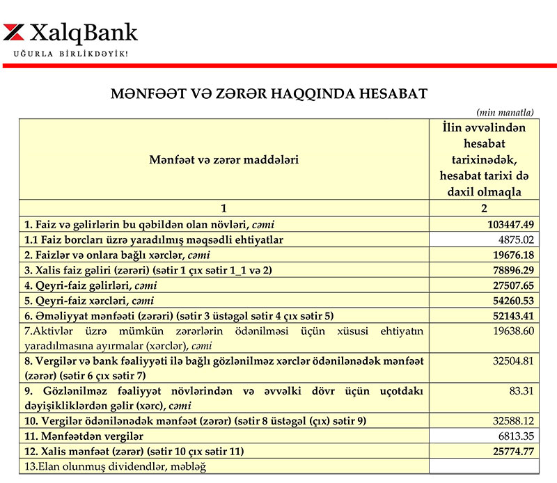 Ötən ilin Bankın əməliyyat mənfəəti 4 milyon 304 min manat artaraq 52 milyon 143 min manat təşkil edib. Qeyri-faiz gəlirləri artması ilə bərabər qeyri-faiz xərclərinin azalması, eyni zamanda faiz borcları üzrə yaradılmış məqsədli ehtiyatlara ayırmanın düşməsi (2 milyon 815 min manat azalıb ) hesabına əməliyyat mənfəətində artım baş verib.