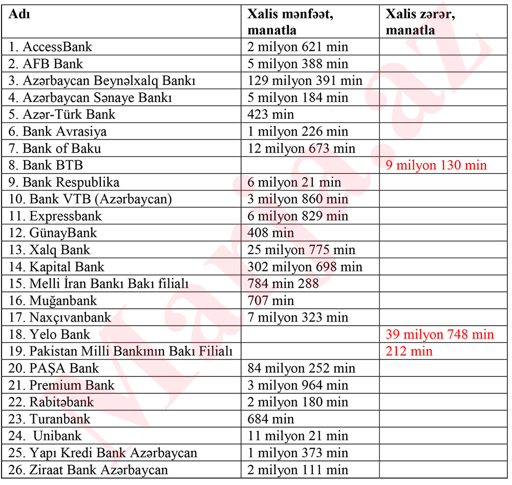 Ən çox xalis mənfəət Kapital Bankda, ən çox xalis zərər isə Yelo Bankda qeydə alınıb.
