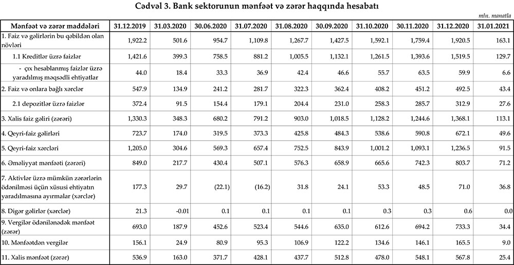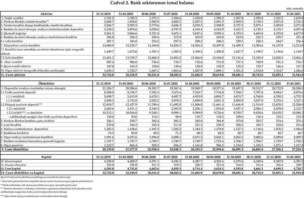 31 yanvar 2021-ci il tarixinə olan bank sektorunun əsas göstəriciləri açıqlanıb.