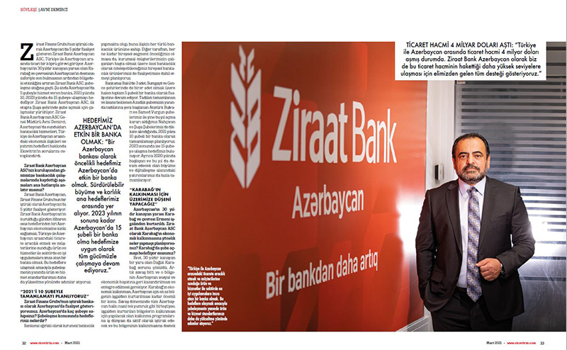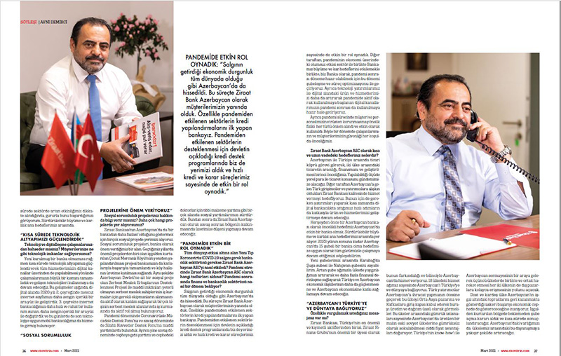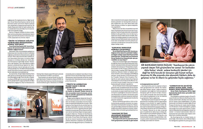 “Ziraat Bank Azərbaycan”ın sədri Avni Demirci aylıq çap olunan iqtisadiyyat jurnalı “Ekovitrin”ə müsahibə verib.
