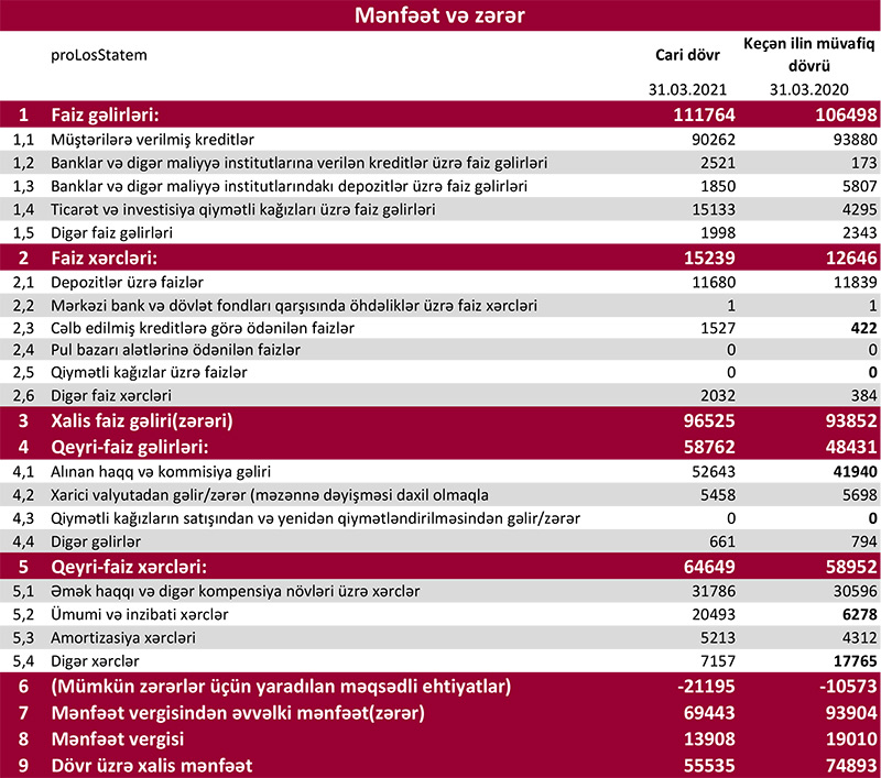 Gəlirlər xərclərdən daha çox artdığından Kapital Bankın əməliyyat mənfəəti 83 milyon 331 min manatdan 90 milyon 638 min manata yüksəlib. Bank ilk rübdəki 90 milyon 638 min manat əməliyyat mənfəətindən 21 milyon 195 min manat ehtiyata ayırıb və 13 milyon 908 min manat mənfəət vergisi ödəyib. 2020-ci ilin ilk rübündə isə ehtiyatdan 10 milyon 573 min manat azad olmuş və 83 milyon 331 min manat mənfəətə əlavə edilmişdi. Bank 93 milyon 904 min manat mənfəətindən 19 milyon 10 min manat mənfəət vergisi ödəmişdi. Mümkün zərərlər üçün yaradılan məqsədli ehtiyata ayırma KapitalBankın xalis mənfəətinin azalmasına səbəb olub.