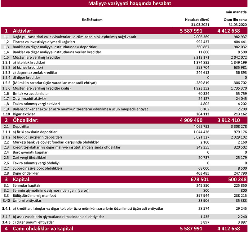 “Kapital Bank” ASC 2021-ci ilin 1-ci rübünü 55 milyon 535 min manat xalis mənfəət ilə başa vurub. Bank 2020-ci ilin eyni dövrünü 74 milyon 893 min manat xalis mənfəət ilə bağlamışdı. Bankın gəlirləri və əməliyyat mənfəəti artıb. Xalis mənfəətin azalması mümkün zərərlər üçün yaradılan məqsədli ehtiyata ayırma ilə bağlıdır.