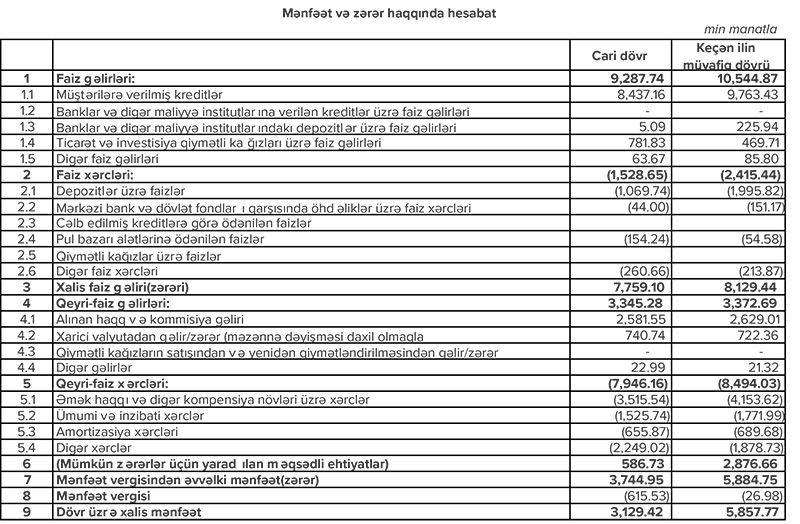 Müqayisə üçün qeyd edək ki, 2020-ci ilin 1-ci rübündə “Expressbankı”ın cəm əməliyyat gəlirləri 13 milyon 918 min manat, cəmi əməliyyat xərcləri 10 milyon 910 min manat, əməliyyat mənfəəti 3 milyon 8 min manat təşkil etmişdi. Eyni zamanda ehtiyatdan azad olmuş 2 milyon 876 min manat mənfəətə əlavə edilmiş və mənfəət 5 milyon 884 min manata yüksəlmişdi. “Expressbankı” 27 min manat mənfəət vergisi ödədiyindən 2020-ci ilin ilk rübünü 5 milyon 858 min manat xalis mənfəət ilə bağlamışdı.