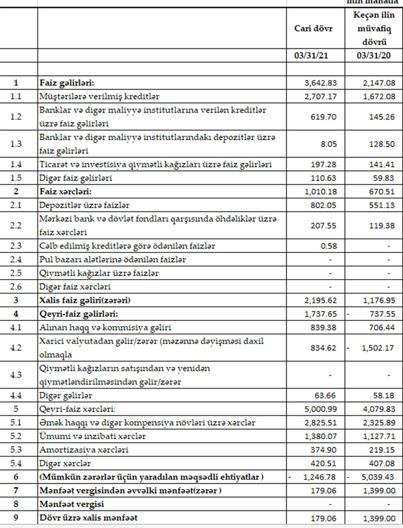 Müqayisə üçün qeyd edək ki, 2020-ci ilin ilk rübündə də “VTB Bank Azərbaycan”ın xərcləri gəlirlərini üstələdiyindən 3 milyon 640 min manat əməliyyat zərəri yaranmışdı. Mümkün zərərlər üçün yaradılan məqsədli ehtiyatlardan azad olmuş 5 milyon 39 min manat hesabına həm əməliyyat zərəri bağlanmış, həm də Bankın 1 milyon 399 min manat xalis mənfəəti formalaşmışdı.