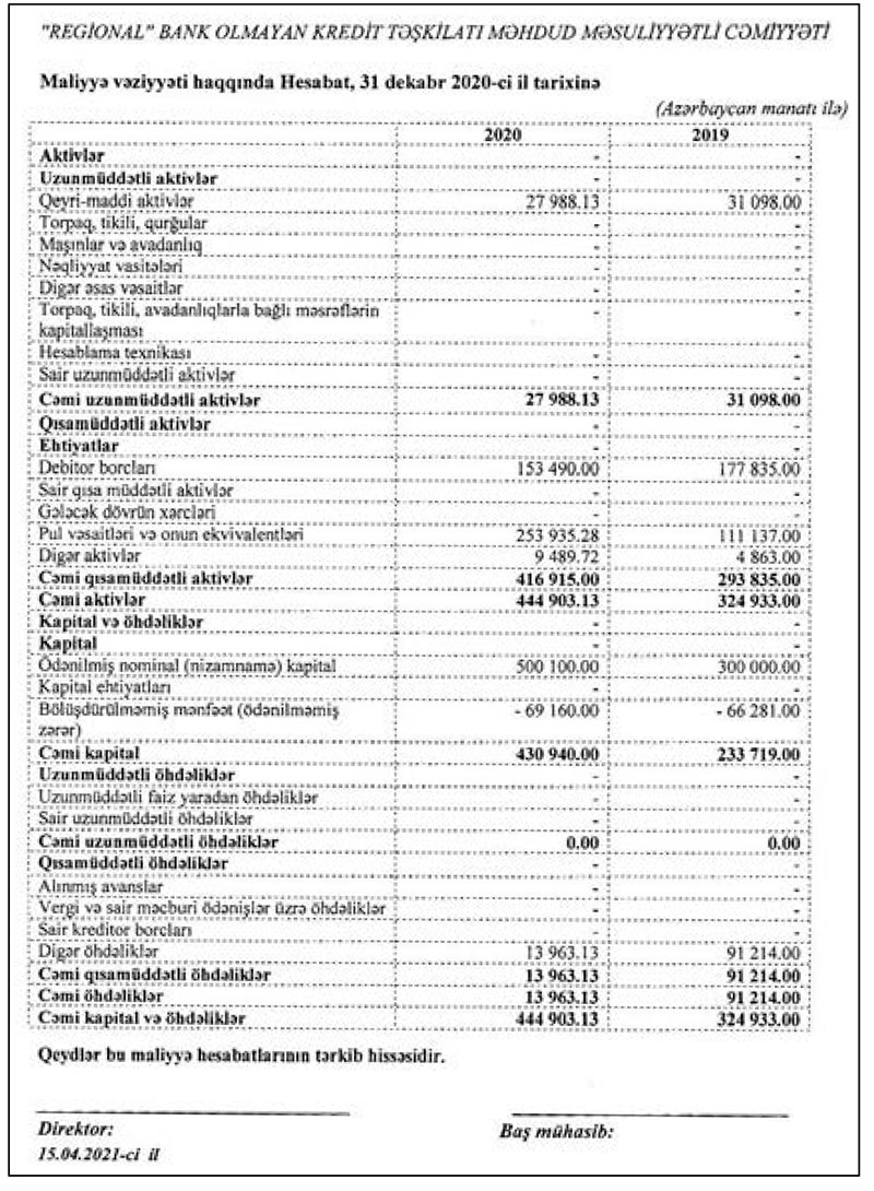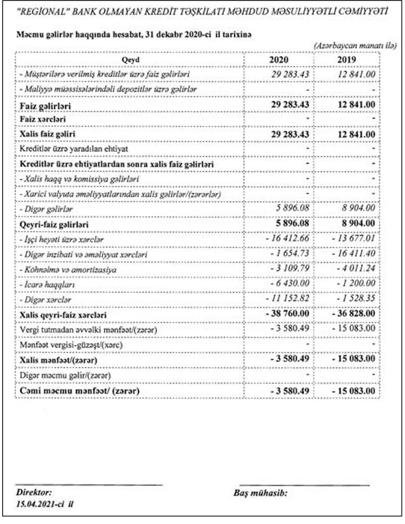 "Regional" Bank olmayan kredit təşkilatı 2020-ci ili 3 min 580 manat xalis zərər ilə başa vurub. Müqayisə üçün qeyd edək ki, 2019-cu ildə təşkilatın xalis zərəri 15 min 83 manat təşkil etmişdi. Beləliklə, "Regional" BOKT-ın xalis zərəri 4 dəfədən çox azalıb.