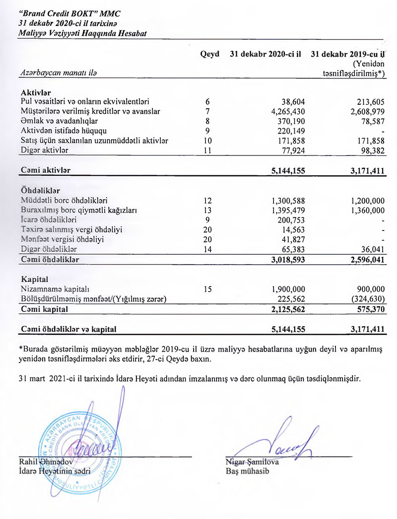 Bu il yanvarın 1-nə “Brand Credit”in aktivləri 5 milyon 144 min manat olub ki, bu da, illik müqayisədə 62,2% çoxldur. Bunun 4 milyon 265 min manatı müştərilərə verilmiş xalis kreditlərdir. 2020-ci ildə BOKT-un kredit portfeli 63,5% böyüyüb.