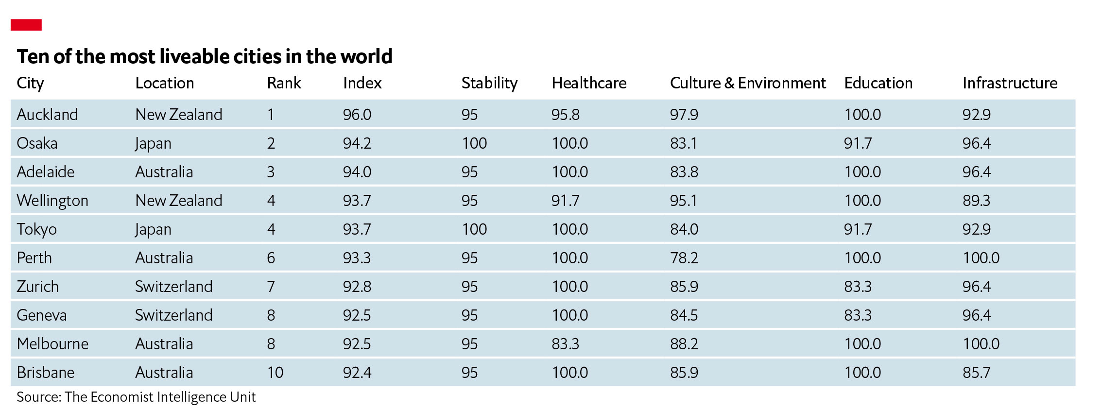 İlk 10-luğa Avstraliyadan 4 şəhər düşüb. Bunun əsas səbəbi ölkənin koronavirus pandemiyası ilə ən yaxşı mübarizə aparanlardan biri olması, vaxtında qısamüddəti sərt karantinə gedərək, infeksiyanın yayılmasını məhdudlaşdırması, bundan sonra isə insanların həyat və fəaliyyətində demək olar ki, məhdudiyyət və mənfi dəyişikliyin baş verməməsidir.
