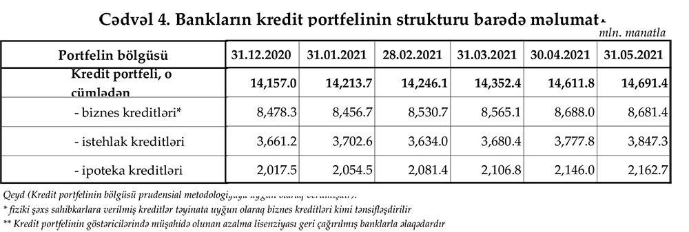 Marja Mərkəzi Banka istinadən xəbər verir ki, 2021-ci ilin Aprel ayı ilə müqayisədə May ayında istehlak kreditləri 69,5 milyon manat artaraq 3 milyard 847.3 milyon manata, ipoteka kreditləri 16,7 milyon manat artaraq 2 milyard 162.7 milyon manata yüksəlib, biznes kreditləri isə 6,6 milyon manat azalaraq 8 milyard 681.4 milyon manata düşüb.