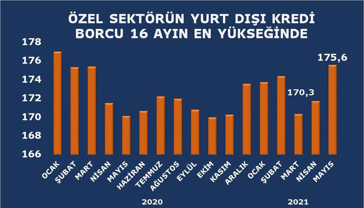 Marja xəbər verir ki, May ayının sonuna olan məlumata görə, Türkiyənin özəl sektorunun xaricdən cəlb etdiyi cəmi kreditlər, 2020-ci ilin sonu ilə müqayisədə 2 milyard dollar artaraq 16 ayın ən yüksək səviyyəsinə (175,6 milyard dollar) çatıb.