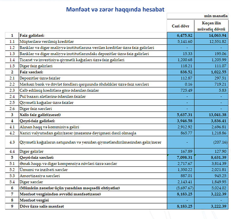Müqayisə üçün qeyd edək ki, 2020-ci ilin birinci yarısında “AFB Bank”ın cəmi əməliyyat gəlirləri 17 milyon 900 min manat, cəmi əməliyyat xərcləri 9 milyon 653 min manat, gəlirlər xərcləri üstələdiyindən əməliyyat mənfəəti 8 milyon 247 min manat təşkil etmişdi. Əməliyyat mənfəətindən 5 milyon 24 min manat mümkün zərərlər üçün yaradılan məqsədli ehtiyatlara ayrıldığından Bank həmin dövrü 3 milyon 223 min manat xalis mənfəət ilə bağlamışdı.