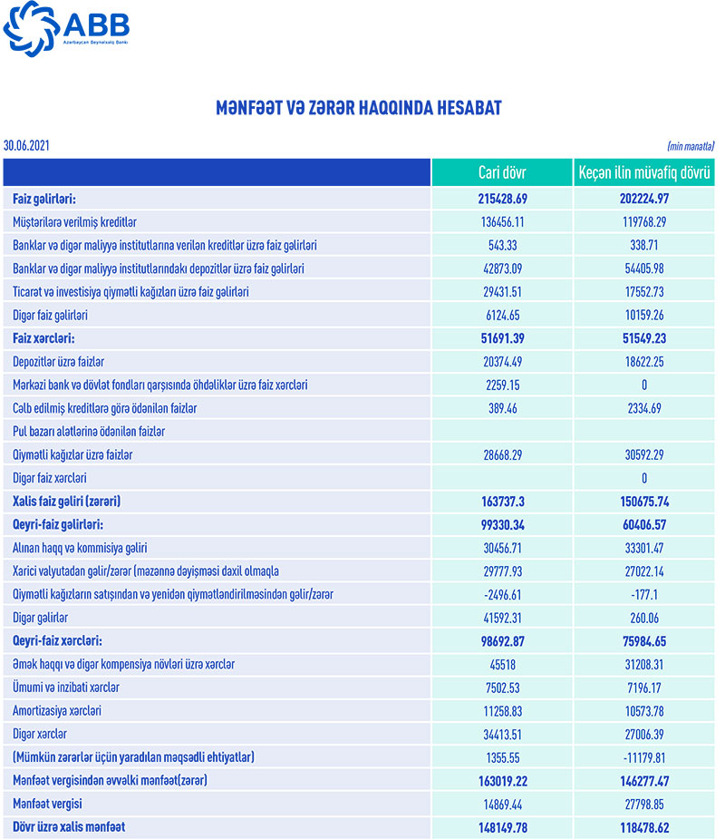 Ötən ilin ilk yarısında mümkün zərərlər üçün yaradılan ehtiyatlardan azad olmuş 11 milyon 179 min manat ABB-nin mənfəət vergisindən əvvəlki mənfəətini artırmışdı. 2021-ci ilin ilk yarısında isə əməliyyat mənfəətindən 1 milyon 355 min manat ehtiyata ayrılıb. Buna baxmayaraq gəlirlərin güclü artımı ilə əlaqədar olaraq mənfəət də artıb və 163 milyon 19 min manat təşkil edib. ABB 163 milyon 19 min manatlıq mənfəət vergisindən əvvəlki mənfəətindən 14 milyon 869 min manat mənfəət vergisi ödəyib və yekunda cari ilin yanvar – iyun dövrünü 148 milyon 150 min manat xalis mənfəətlə bağlayıb.