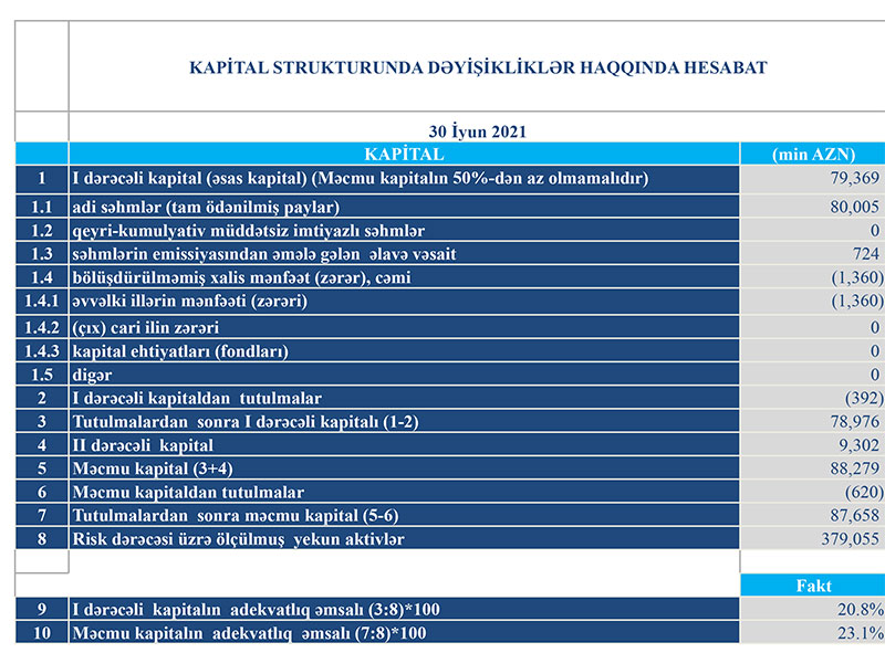 İlk yarımilin sonunda "Turanbank"da I dərəcəli kapitalının adekvatlıq əmsalı 20,8%, məcmu kapitalının adekvatlıq əmsalı 23,1% təşkil edib. Beləliklə, Bankın kapital adekvatlığı göstəriciləri tənzimləyici orqanın müəyyən etdiyi normalardan (müvafiq olaraq 5% və 10%) əhəmiyyətli dərəcədə yüksək olub.