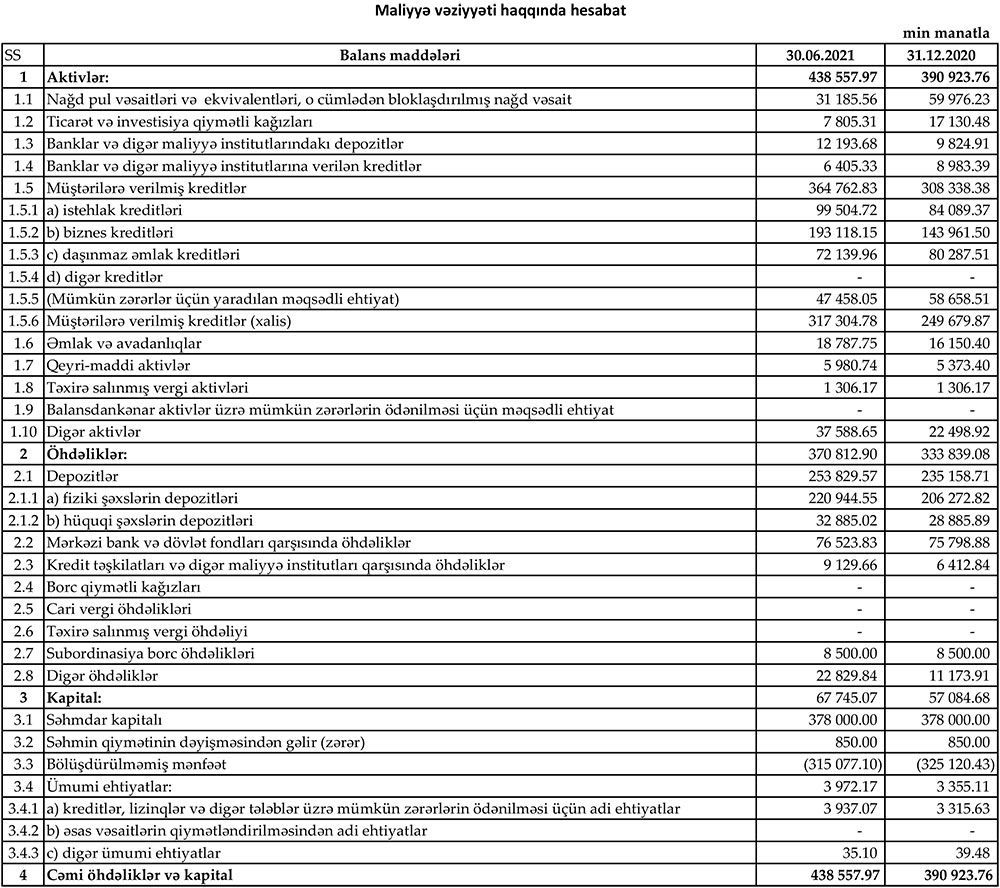 Bankın yaydığı press-relizdə qeyd edilib ki, ötən rüb olduğu kimi, bu rüb də Bankın əsas maliyyə göstəriciləri üzrə pozitiv dinamika müşahidə olunub. Belə ki, Bank hesabat dövrünü 10 milyon manat xalis mənfəətlə başa vurub. Eyni zamanda cəmi aktivlər ötən ilin sonu ilə müqayisədə 47.5 milyon manat artaraq 438.6 milyon manata çatıb.