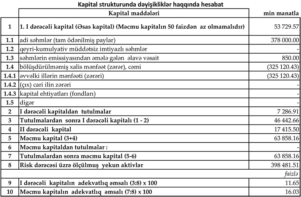 Hesabat dövrü üzrə bankın xalis faiz gəlirləri 21.3 milyon manat təşkil edib. Bu isə ötən ilin anoloji periodu ilə müqayisədə 20% artım deməkdir. Hazırda Bankın məcmu kapitalı 63.86 milyon manatdır, bu göstərici ilin əvvəlindən 10 milyon manat, requlyativ tələbdən isə 13.86 milyon manat çoxdur.