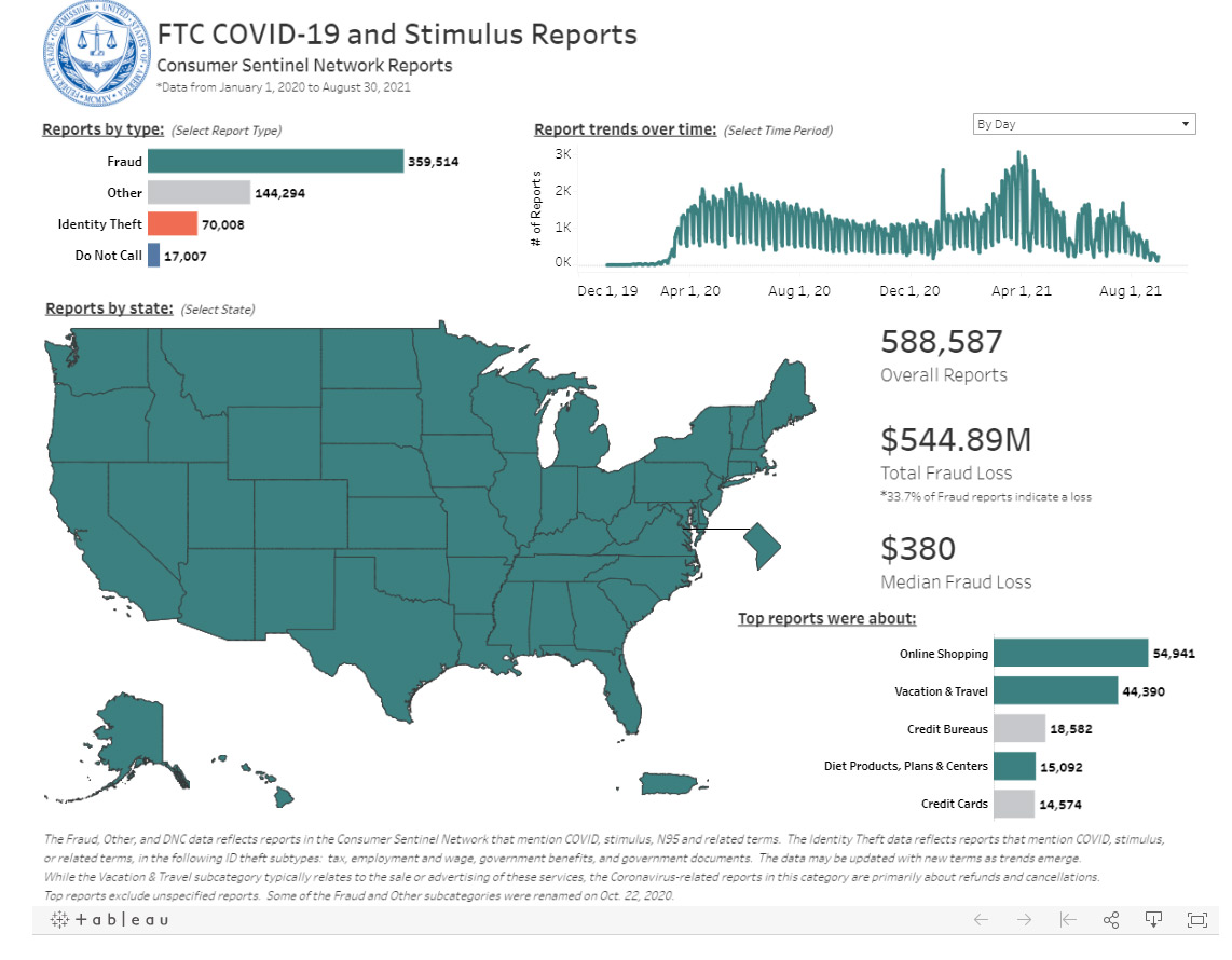 Federal Ticarət Komissiyasına (FTC) həmin dövrdə pandemiya mövzusunda 589 min müştəri şikayəti daxil olub. Bunların 61%-dən çoxu sırf fırıldaqçılıqla bağlıdır. Onlayn ticarətdən səyahət və turizm paketlərinin satışına qədər sahələrdə bir müştərinin orta itkisi 380 dollar olub.