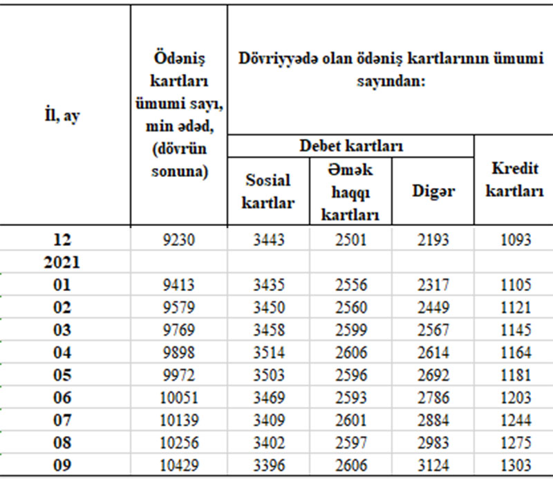 Cari ilin 9 ayı ərzində (yanvar-sentyabr dövründə) sosial kartların sayı 47 min ədəd azalıb, əməkhaqqı kartlarının sayı 105 min ədəd, sosial və əməkhaqqı kartı olmayan digər debet kartlarının sayı 931 min ədəd, kredit kartlarının sayı isə 210 min ədəd artıb.